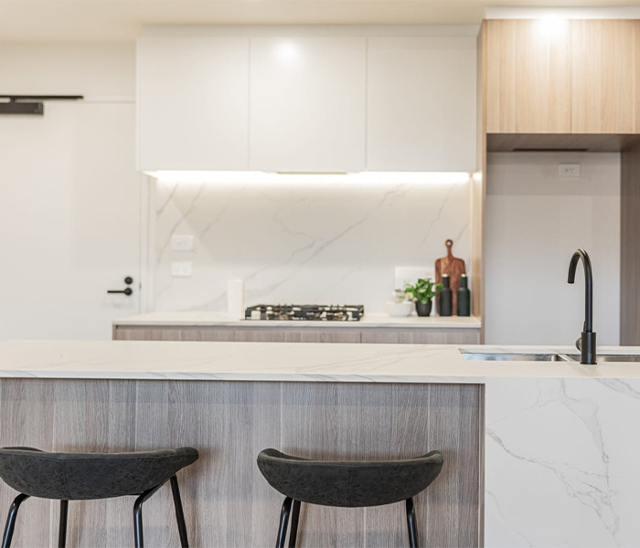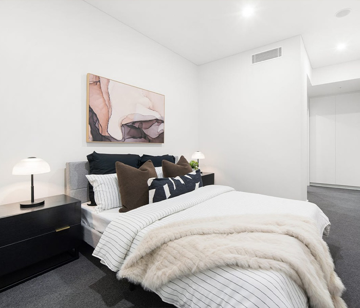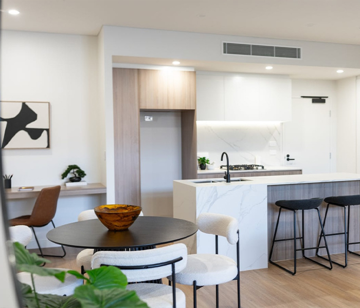 Generous 2.7m high ceilings and wide timber flooring; Open-plan living and dining areas flowing seamlessly to private outdoor spaces; Designer kitchens with Italian SMEG appliances, sleek Caesarstone benchtops, and island benches; Ducted, individually zoned Samsung inverter air-conditioning for year-round comfort